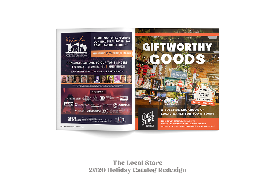 The Local Store puts out two catalogs each year around the holidays. Our annual Holiday Catalog goes directly into the center Volume One’s Best of the Holidays issue and is used to connect with the general public. The Bulk Gift Basket Catalog is released in late Fall and promotes our bulk order gift basket program to local businesses who might send gifts to their employees or clients. I was able to redesign each of these catalogs and make a lot of design decisions myself. A big goal of mine was to incorporate a lot more photography (taken by myself and our part-time Volume One photographer) while also making the overall catalogs easy to sustain and update each year.