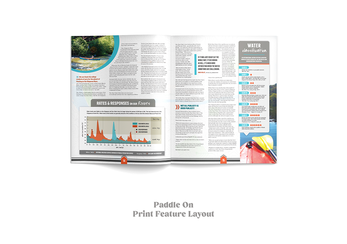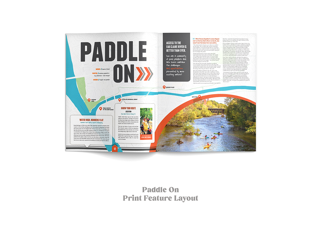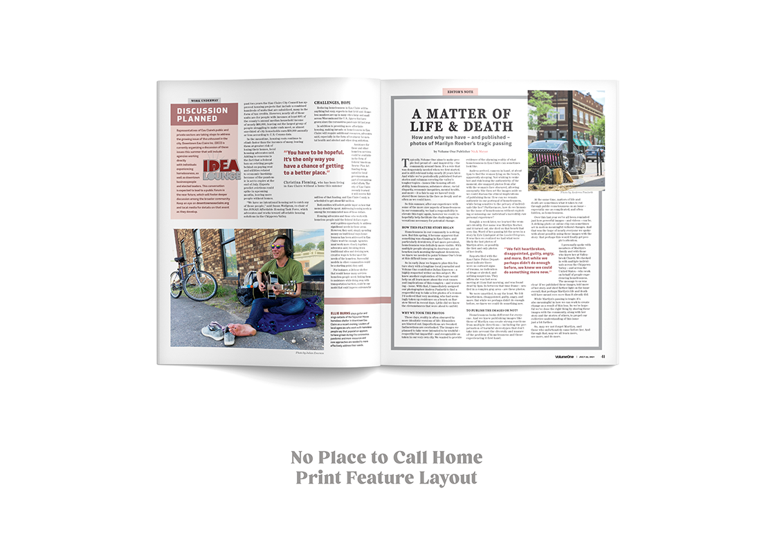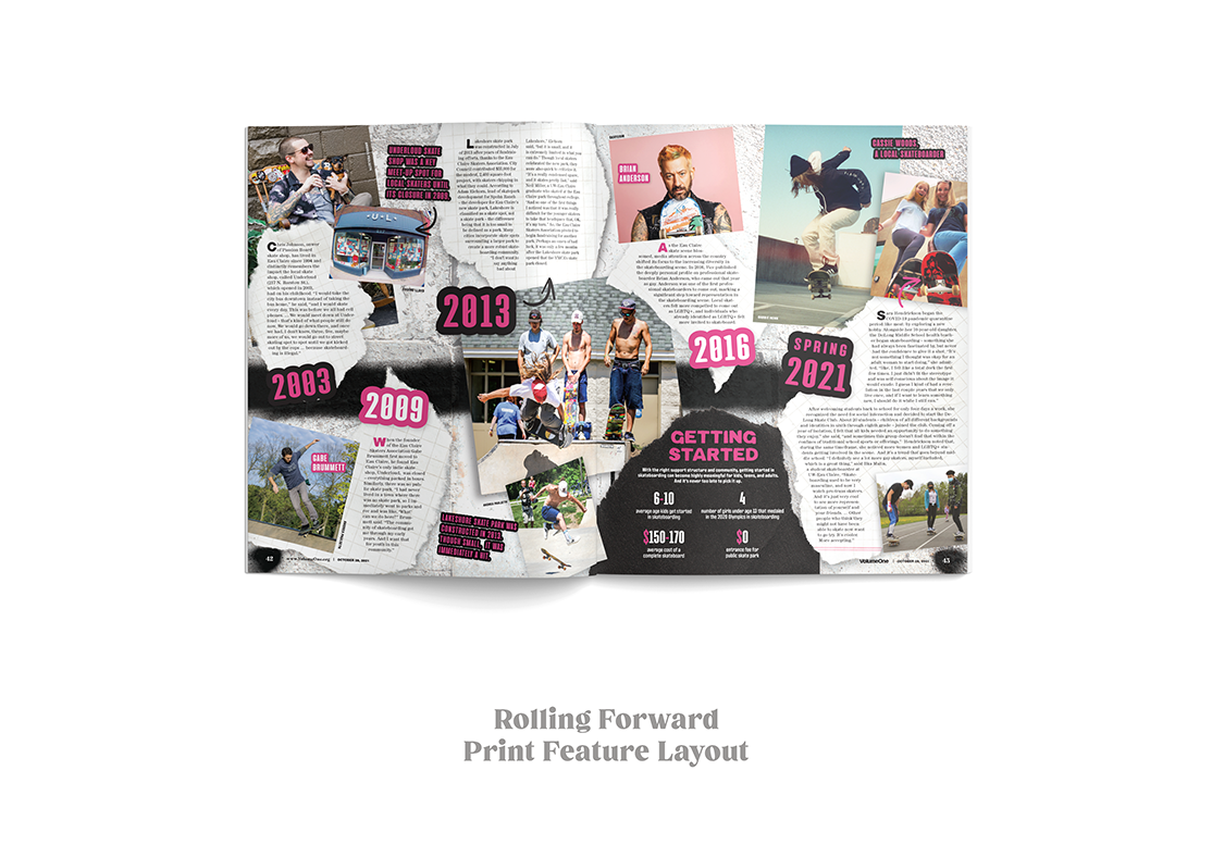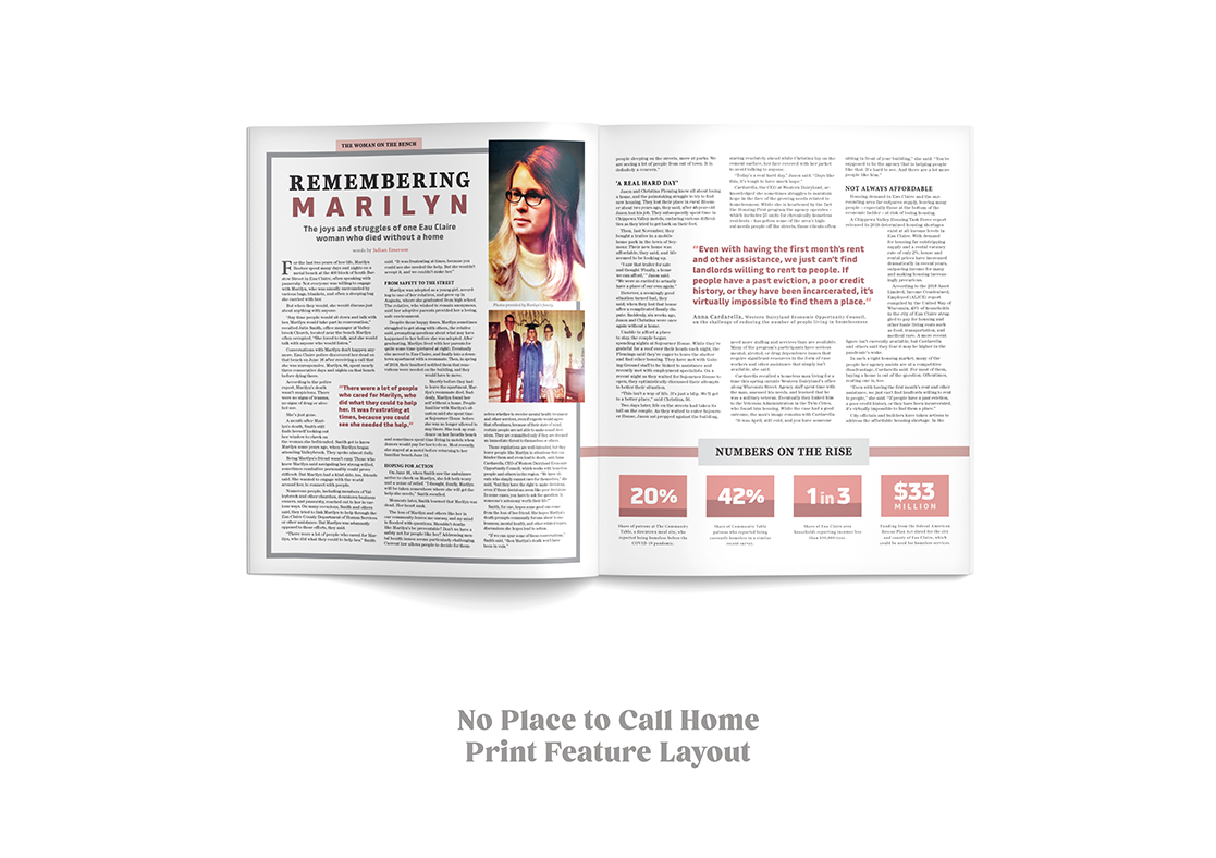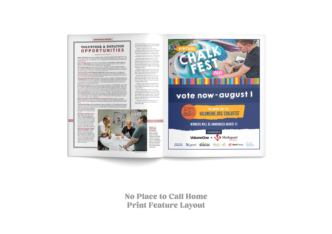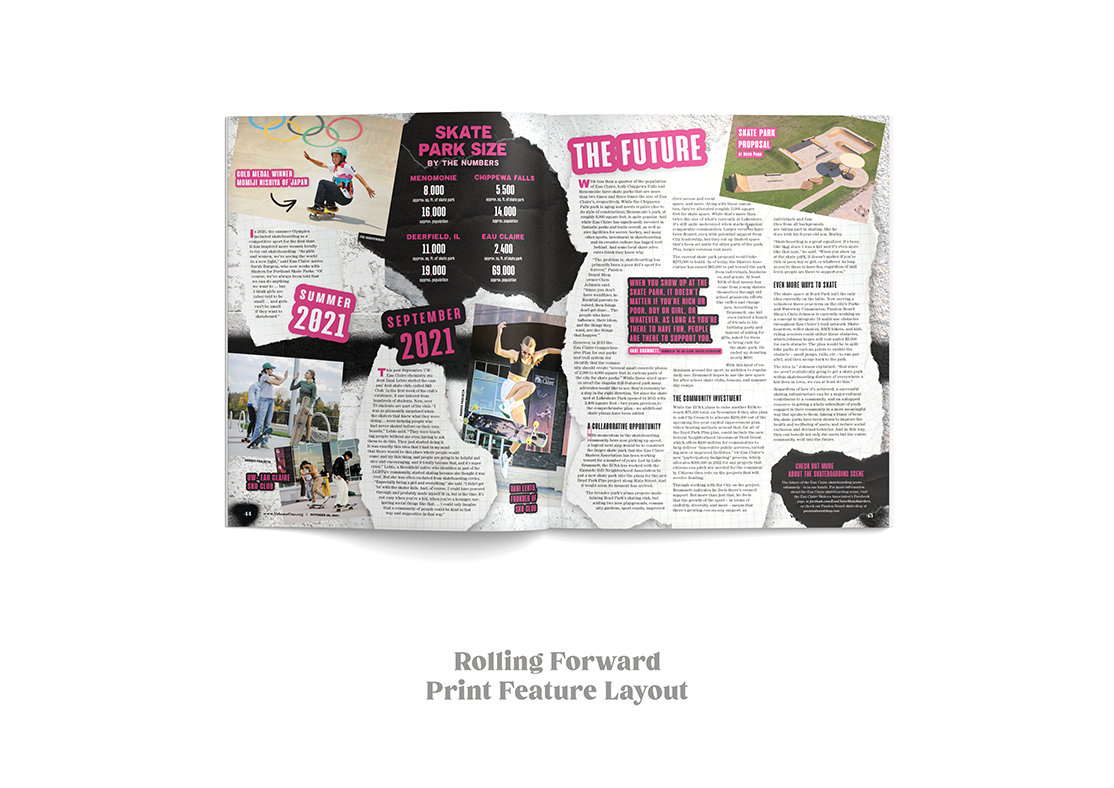 Feature stories are something Volume One tries to run pretty regularly if possible. Not only do feature stories break up an issue’s regular content by highlighting unique topics, but they also create really cool opportunities for designers to flex our creative muscles. Design parameters are pretty open when it comes feature stories, so it’s really important to read the story first to make sure the content + design work together. Feature stories also utilize social media as a way to reach audiences beyond the print issue, and I was honored to win the Milwaukee Press Club’s 2021 Bronze Award for Best Journalistic Use of Social Media to Tell or Enhance a Story.